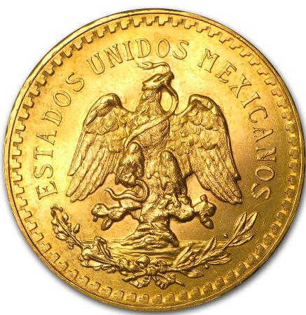 Plus grosse pièce d'or boursable qui éxiste, la pièce de 50 pesos mexicaine est la pièce qui contient le plus d'or pur, ce qui en fait un atout pour les gros investisseurs. Une pièce très échangée en France et dans le monde entier au vu du nombre de pièces émises jusqu'en 1947.